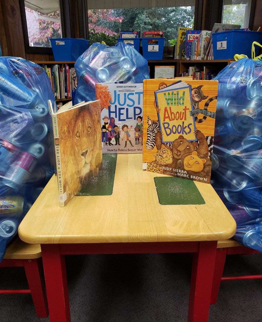 We participate in the Bottle Drop Give Blue Bag program. You can bring your clean cans and bottles to the library, or you can ask for one of our blue bags and return it filled to the library, or any Bottle Drop location.